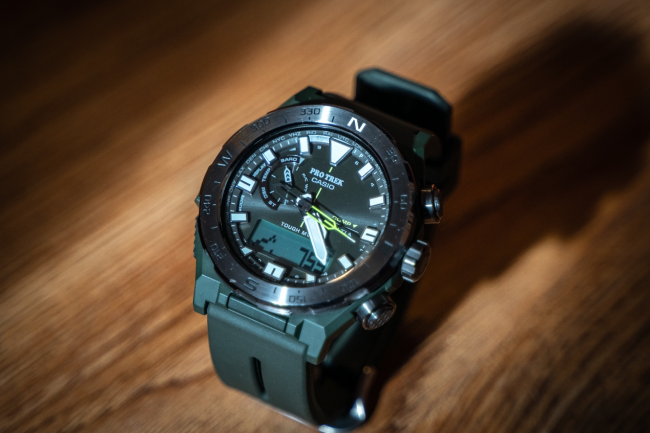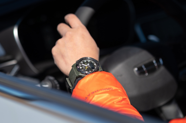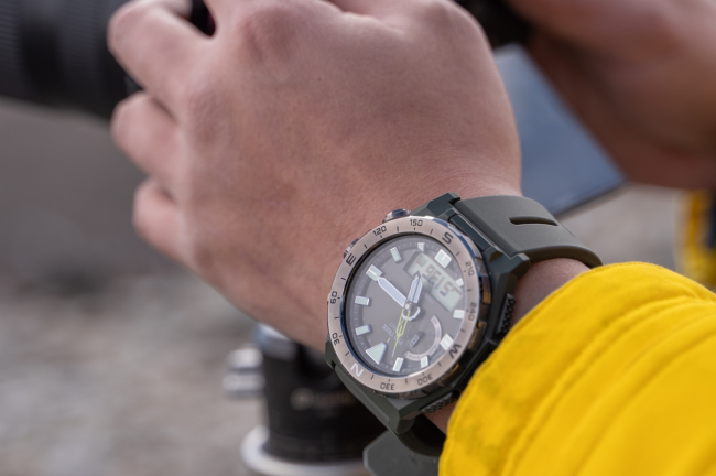 手表外观上配备了军绿配色的杜拉软表带与可旋转金属表圈,搭配硬派的表体切割。除了外观设计上十分硬朗以外,其手表专业的户外性能也十分的出色与全面,搭载了第三代三重感应器能实时反馈周围环境的海拔、气压、温度数据,外加罗盘功能能让使用者清晰的了解自身所处方位。能满足大部分的户外作业人员的户外专业需求。